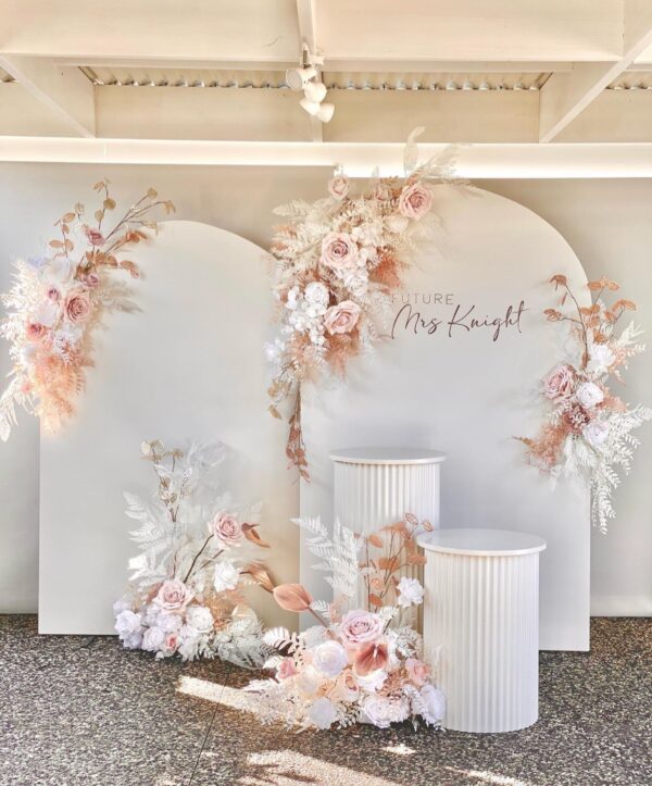 This stunning package features two large white arch backdrops, creating a minimalist yet graceful foundation for the display. One panel is elegantly personalized with a custom script title such as “Future Mrs. [Last Name]”, which can be updated to match the bride’s name or the occasion’s theme. The clean white arches offer a timeless canvas, ideal for both indoor and outdoor venues, from garden parties to modern banquet halls.