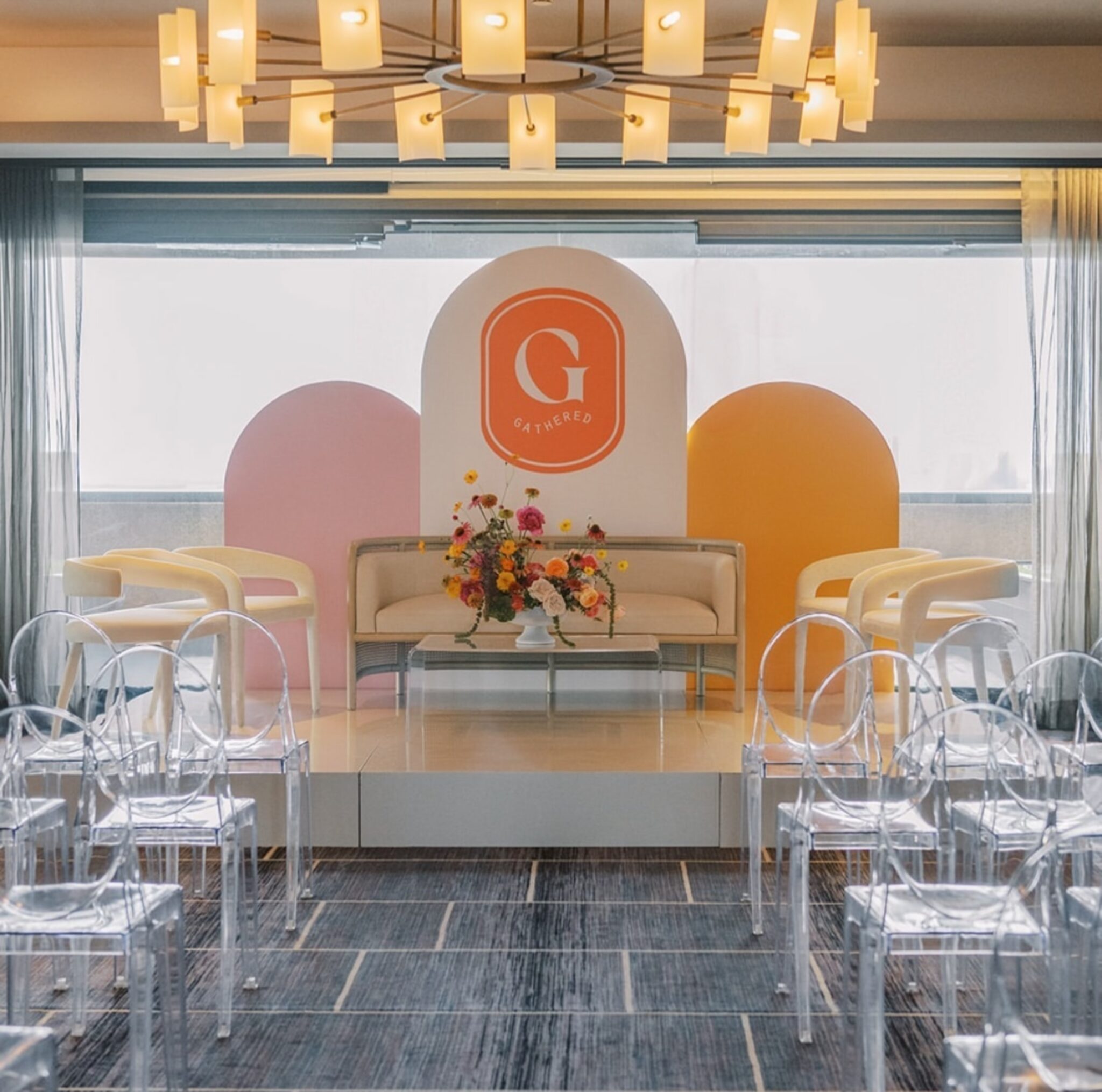 The backdrop includes a tall center arch panel with space for custom branding—your logo, company name, event title, or monogram—making it ideal for corporate gatherings and marketing events. The surrounding curved panels in warm, cheerful shades (like blush and golden yellow) add depth and balance, framing the stage beautifully for photos, video recordings, and guest seating arrangements. The overall design is clean and uncluttered, allowing speakers, hosts, and panelists to stand out while keeping the space visually elevated.