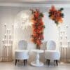 This setup features a sleek, high-gloss white arch panel as its centerpiece, personalized with the couple’s names in delicate vinyl or laser-cut acrylic lettering. The arch’s smooth surface contrasts beautifully with the softness of the floral accents, creating a contemporary-yet-romantic focal point for your event. A soft blush and peach color palette brings a warm, celebratory feeling to the space, while still maintaining a refined, minimalist aesthetic. These high-quality silk florals include a curated selection of roses, garden roses, dahlias, peonies, and hydrangeas paired with lifelike greenery and cascading foliage for a lush, organic look.