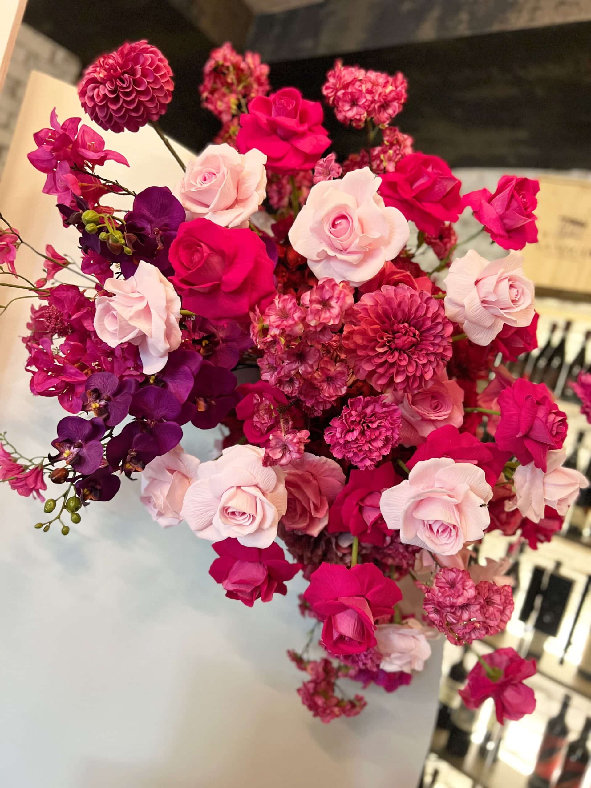 Clusters of lush silk florals in various shades of pink — from soft blush and bubblegum to deep magenta and rich raspberry — frame the backdrop and pedestal. A mix of roses, ranunculus, hydrangeas, and orchids add texture, movement, and visual interest. These floral arrangements are skillfully designed to appear as if blooming from the display, creating a luxurious and immersive floral experience.
