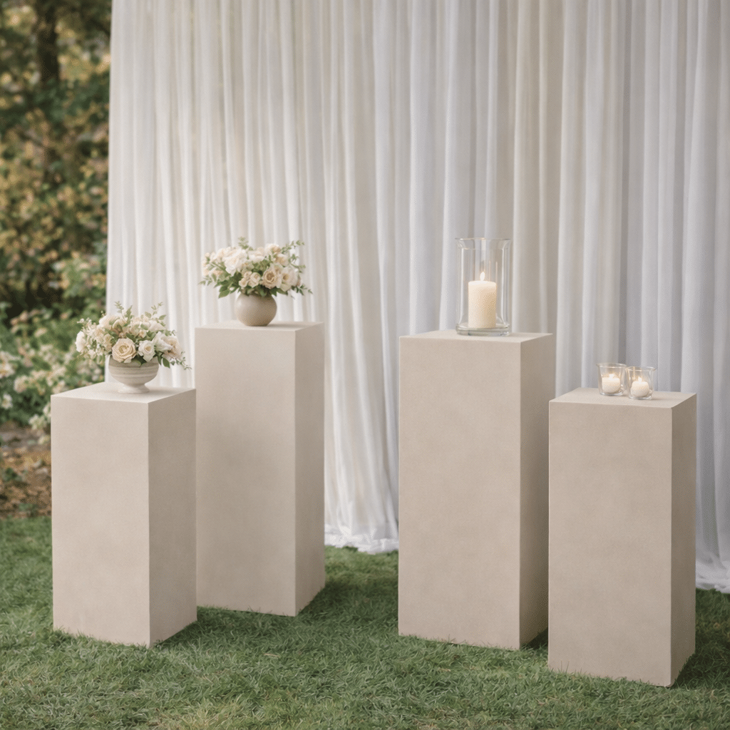 Available as a full set or individually, our taupe square plinth rentals are a versatile addition to any event styling package. They can be used for outdoor garden ceremonies, luxury estate weddings, tented receptions, and corporate brand activations. The clean, architectural silhouette elevates even the simplest decor pieces, creating a cohesive and polished event look.