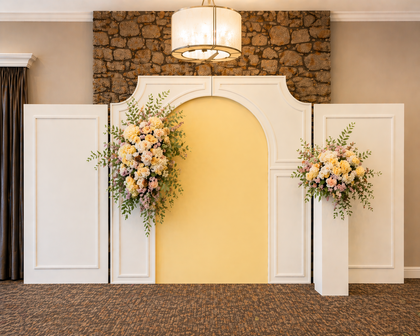 Create a timeless and sophisticated setting for your special event with our Elegant Panel Floral Backdrop, designed to bring elegance and softness to any space. This refined setup features a beautifully crafted arched center panel with a soft yellow vinyl finish, complemented by clean white framing panels and delicate pastel floral arrangements on each side.