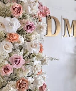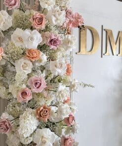 On either side of the panel stand two lush floral towers, artfully arranged with a cascading mix of high-quality silk flowers. The color palette includes white, ivory, soft blush, peach, and dusty rose roses, delicately paired with baby’s breath, hydrangeas, and floral fillers for texture and volume. The result is a romantic, garden-inspired effect that adds life and vibrancy to the clean backdrop.