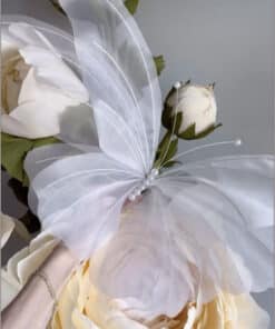The floral bush base is a lush composition of white roses, delicate filler flowers, and soft greenery that together create texture, depth, and elegance. Each bloom is selected for its realistic detail and timeless appeal, forming a harmonious base that enhances the grandeur of the butterfly above. The design’s neutral color palette allows it to pair beautifully with any event theme — from minimalist modern to classic romantic — while maintaining a cohesive, refined aesthetic.