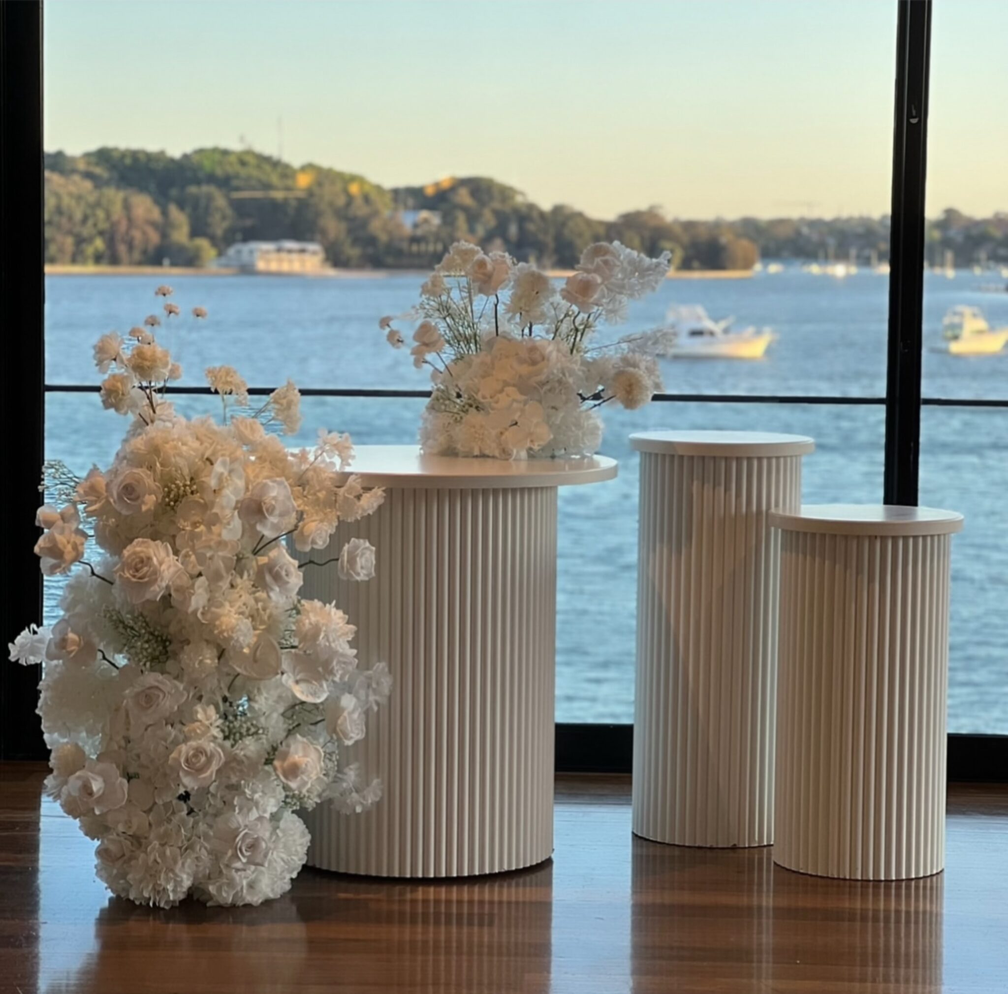 Elevate your event styling with our Minimalist Ripple Plinth Trio a timeless, modern set designed to create an elegant focal point for weddings, bridal showers, baptisms, engagements, corporate events, and luxury celebrations. This package features three coordinating white ripple cylinder plinths in varying heights, offering a clean, architectural look that instantly upgrades any space. The vertical fluted texture adds depth and dimension while keeping the overall aesthetic minimal, polished, and photo-ready.