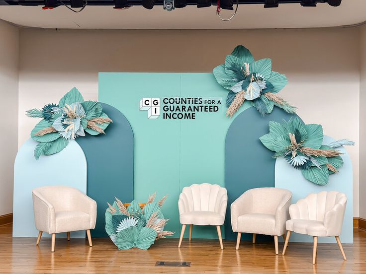 The design incorporates dimensional curved panels that add depth and architectural interest while maintaining a clean and polished aesthetic. Oversized custom floral installations in coordinating teal tones with soft neutral pampas accents bring texture and a modern artistic touch without overwhelming the space. This setup is perfect for companies looking to create a branded, photo-friendly stage environment that feels stylish and elevated.