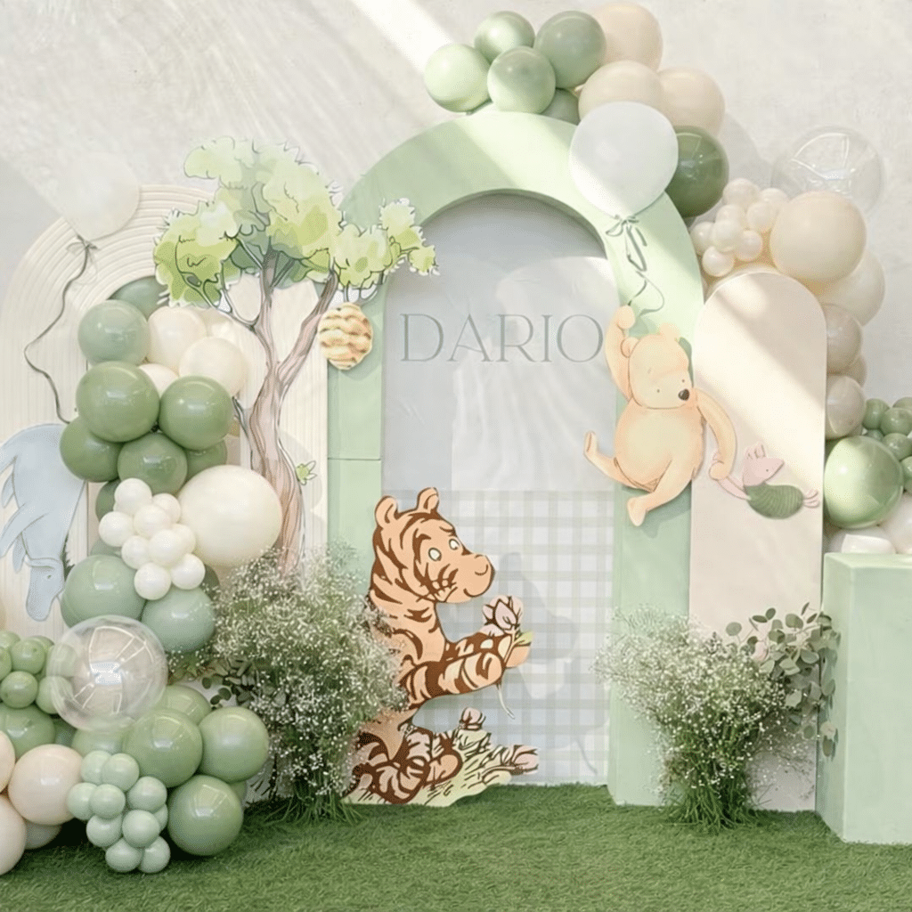 Create a magical and playful atmosphere for your child’s celebration with our Winnie the Pooh Display, a charming decor setup designed for first birthdays, baby showers, kids’ birthday parties, and themed celebrations. This beautiful backdrop combines soft pastel greens, whimsical character illustrations, and lush balloon garlands to create a warm and joyful setting perfect for memorable photos and celebrations.